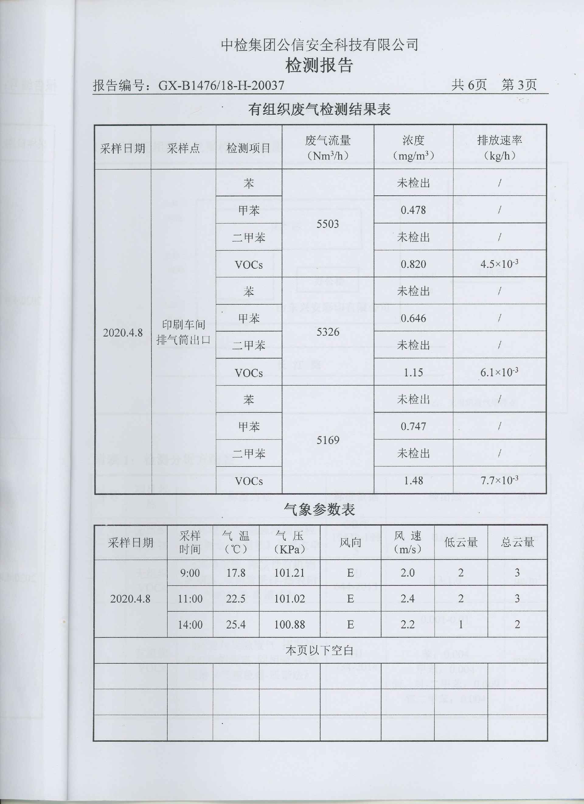 开云官方端网站入口站登录-开云(中国)一直把环保治理工作作为企业发展重中之重,根据市区生态环境保护局要求于2017年8月份率先上了Ⅴ0Cs环保处理设备,印刷车间废气通过收集风管,进入过滤器,将空气颗粒物过滤掉,经过光催化氧化分解剩余有机废气,同时由离子氧化进一步处理残余废气,将有机废气氧化成二氧化碳和水,通过烟囱引高排。2018年2月经有关环保专家验收合格,有机挥发物排放达标。每季度都委托枣庄公信安全科技公司对公司有机挥发物废气各项指标进行检测,下图为最新监测数据: